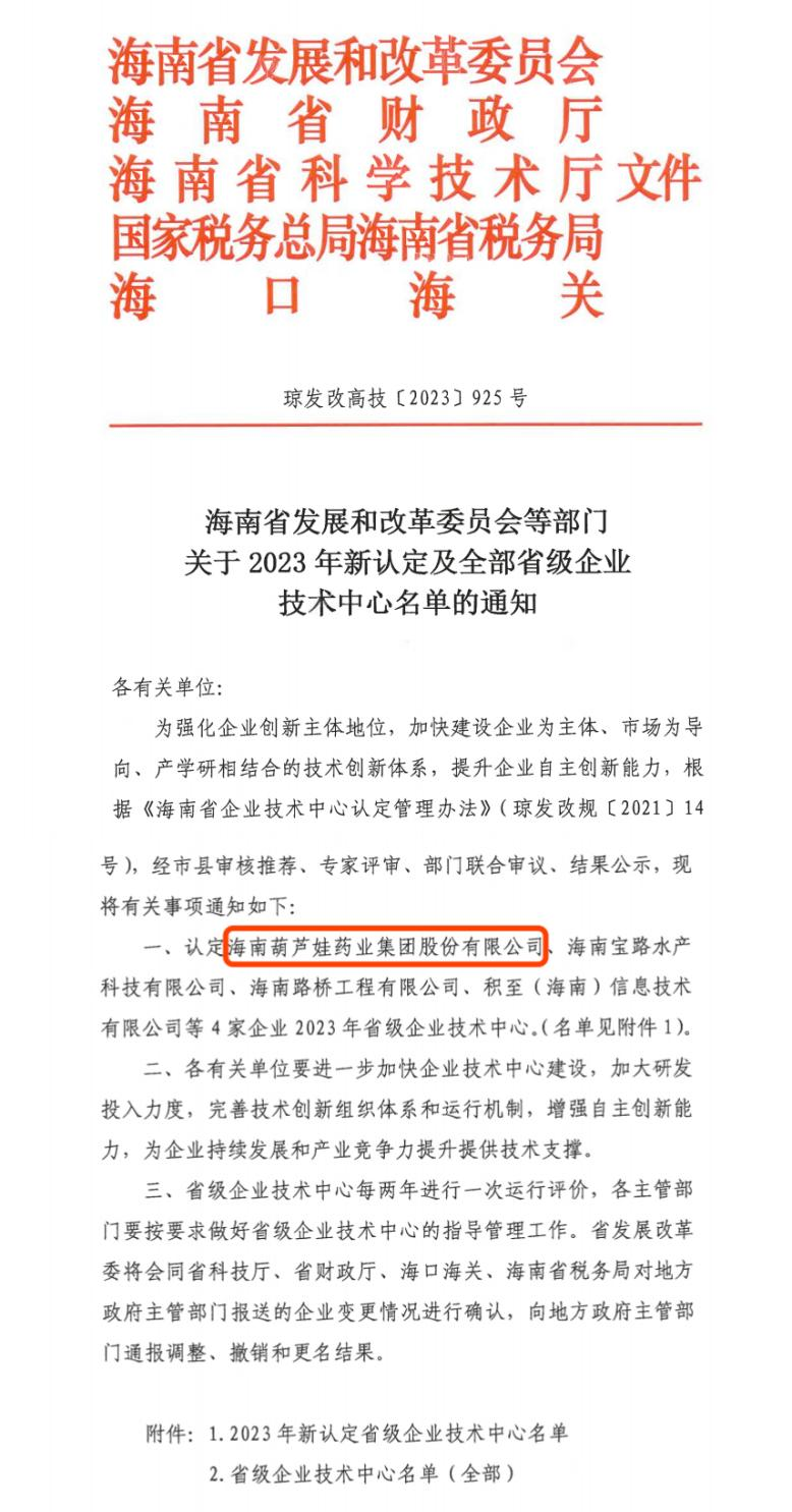 近日,海南省发改委等多部门联合公布了《关于2023年新认定及全部省级企业技术中心名单的通知》,其中,海南人生就是博药业集团股份有限公司成功通过评审,被认定为省级企业技术中心,是本次获批的4家企业之一。